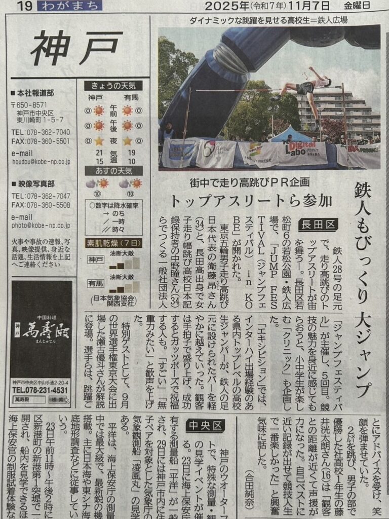 神戸新聞 投稿日 2025年11月10日 著者 Jump Festival 鉄人もびっくり大ジャンプ 街中で走り高跳びPR企画 トップアスリートら企画(2025年11月7日神戸新聞朝刊19面) シェア ツイート LINE コピー この記事を書いた人 Jump Festival 記事一覧